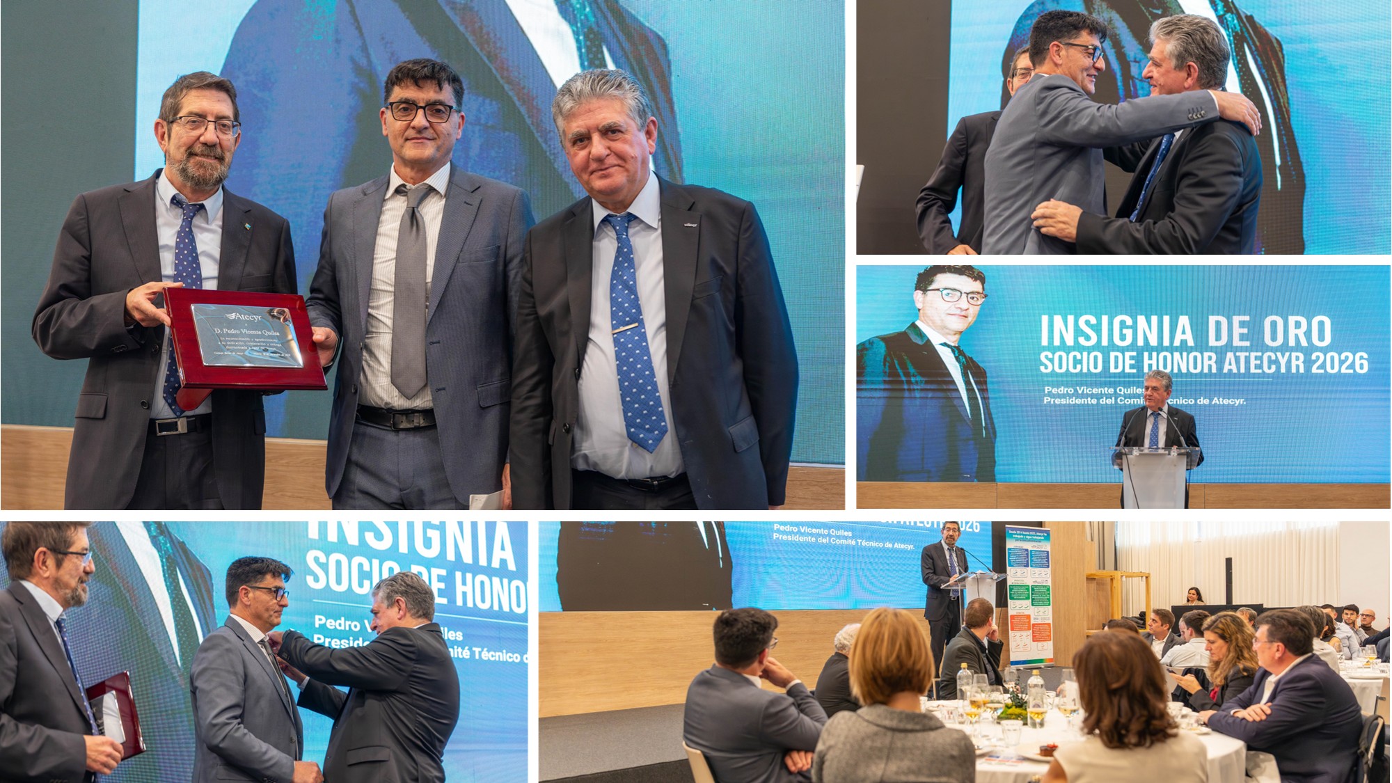 Durante el Almuerzo de Hermandad de Atecyr 2026, celebrado el pasado 10 de febrero, Atecyr hizo entrega de la Insignia de Oro como Socio de Honor a Pedro Vicente Quiles, en reconocimiento a su trayectoria profesional excepcional y a su compromiso constante con la entidad. Este galardón, uno de los más prestigiosos de Atecyr, refleja la relevancia de su contribución al desarrollo técnico y al prestigio de la Asociación a lo largo de los años.