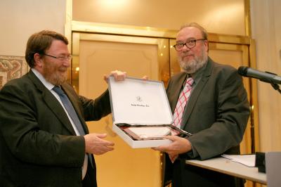 Una vez terminada su presentación, Juan José Quixano procedió a la imposición de la insignia de oro a Javier Izquierdo, y la entrega de una placa conmemorativa.