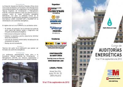 Del 10 al 17 de septiembre, ha tenido lugar un curso de AUDITORÍAS ENERGÉTICAS organizado por la Dirección General de Industria, Energía y Minas de la Comunidad de Madrid y la Fundación de la Energía de la Comunidad de Madrid, en colaboración con la Asociación Técnica Española de Climatización y Refrigeración ATECYR en el Hotel Don Pío, Madrid.