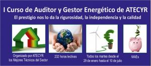 El próximo día 29 de enero dará comienzo el I CURSO DE AUDITOR Y GESTOR ENERGÉTICO organizado por ATECYR con una duración de 232 horas presenciales, se impartirá los martes en jornada de mañana y tarde hasta el día 10 de julio de 2013 en el Aula de Formación de la Asociación, en Madrid.