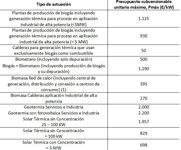 La dotación presupuestaria para la concesión de las ayudas establecidas es de 5.191.176 para la Comunidad Autónoma de Madrid. Según el tipo de actuación, se definen el importe máximo de ayuda por unidad de potencia nominal de los equipos de generación térmica o producción de gases renovables de la instalación: