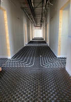 Para su climatización, se han instalado 4400 m2 de suelo radiante modelo R979, el sistema Giacomini para obra nueva, por el que circulan hasta 25.000 metros de tubo PEX R996 con barrera anti oxígeno. Los colectores de la instalación también vienen firmados por Giacomini; en concreto se han usado 150 unidades del modelo R553FP, realizado en tecnopolímero. Este colector modular viene premontado con caudalímetro, lo cual facilita su montaje. Finalmente, la regulación va a cargo de un termostato electrónico K492, que controla cabezales electrotérmicos R473.