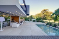 La continuidad de techos, iluminación artificial y pavimento, junto al tratamiento de las piezas de mobiliario que ordenan la planta, contribuye, aún más, a que los espacios exteriores de la vivienda se interpreten como una parte más de la misma.