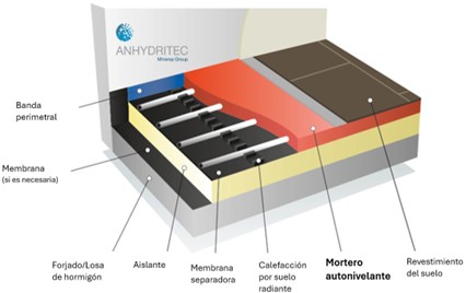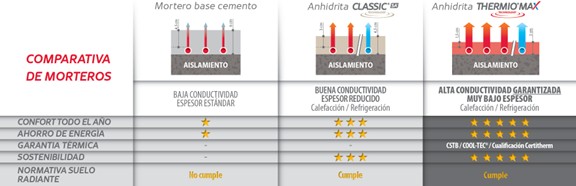 La evolución de los morteros autonivelantes de altas prestaciones permite aplicar placas de mortero con menor espesor, gracias a sus mejores prestaciones mecánicas. La reducción del espesor y la conductividad térmica contribuyen a obtener un confort en menor tiempo y con mayor control. En este sentido, es de reseñar la alta resistencia mecánica que alcanzan los morteros autonivelantes de anhidrita (C30F8: 30 N/mm2 a compresión y 8 N/mm2 a flexión) lo que permite reducir los espesores de mortero sobre el tubo a 15mm) mejorando muy significativamente la reactividad del sistema y la reducción de la temperatura de impulsión lo que permite una fuerte reducción de los consumos de energía con el consiguiente ahorro en la factura.